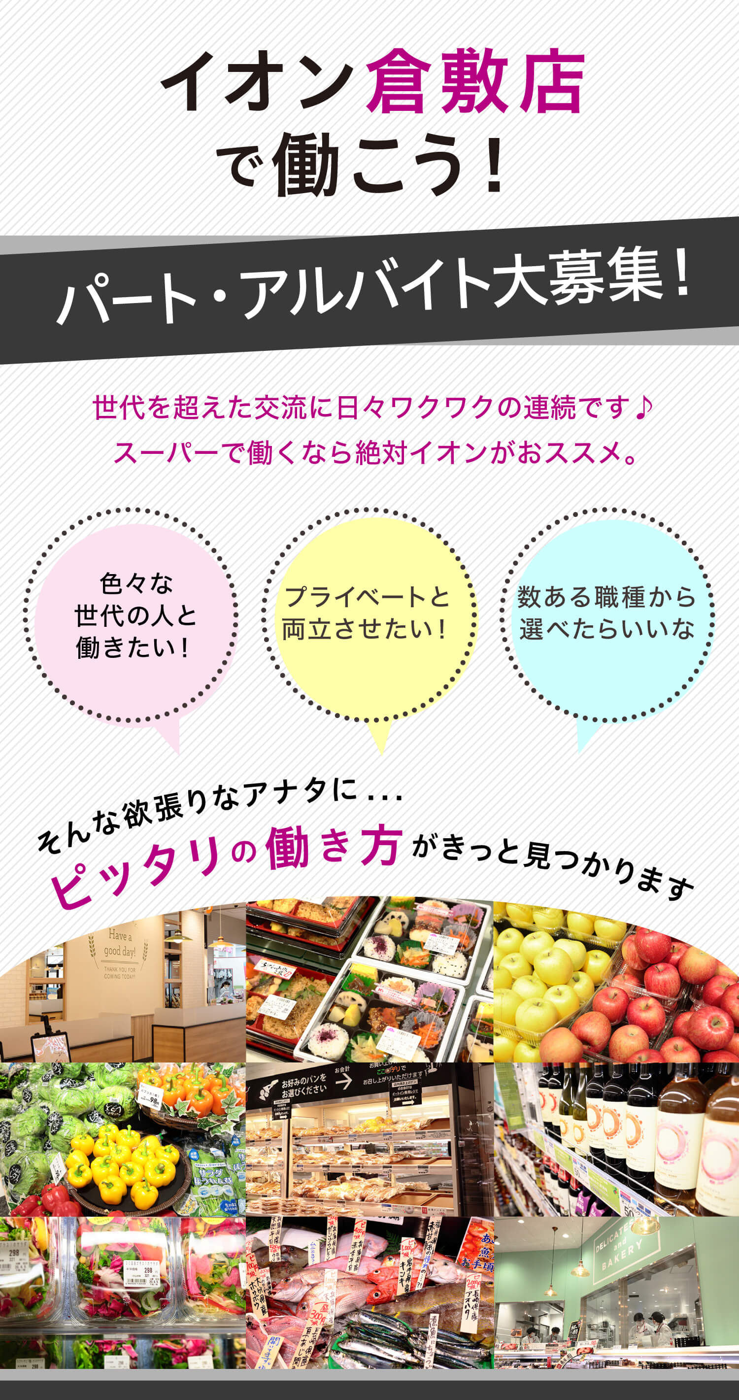 【食品フロア】◆交通費支給!◆未経験OK!◆車通勤OK!◆イオンは待遇・福利厚生が充実しています! 職種:総合スーパーでの食品フロア・銘店・ネットスーパースタッフ 勤務地:岡山県倉敷市水江1 ★車通勤可(規定有) 雇用形態:パート 2026.04.03