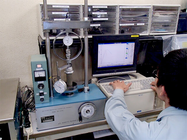 地盤関係の室内試験は日本産業規格(JIS)や地盤工学会基準(JGS)などで規格化、基準化されたものが多いですが、必要に応じて規格外の特殊な試験にも対応します。試験結果はそのまま設計定数として扱われることもあるので試験結果は極めて重要で、責任が伴いますがやりがいがあります。